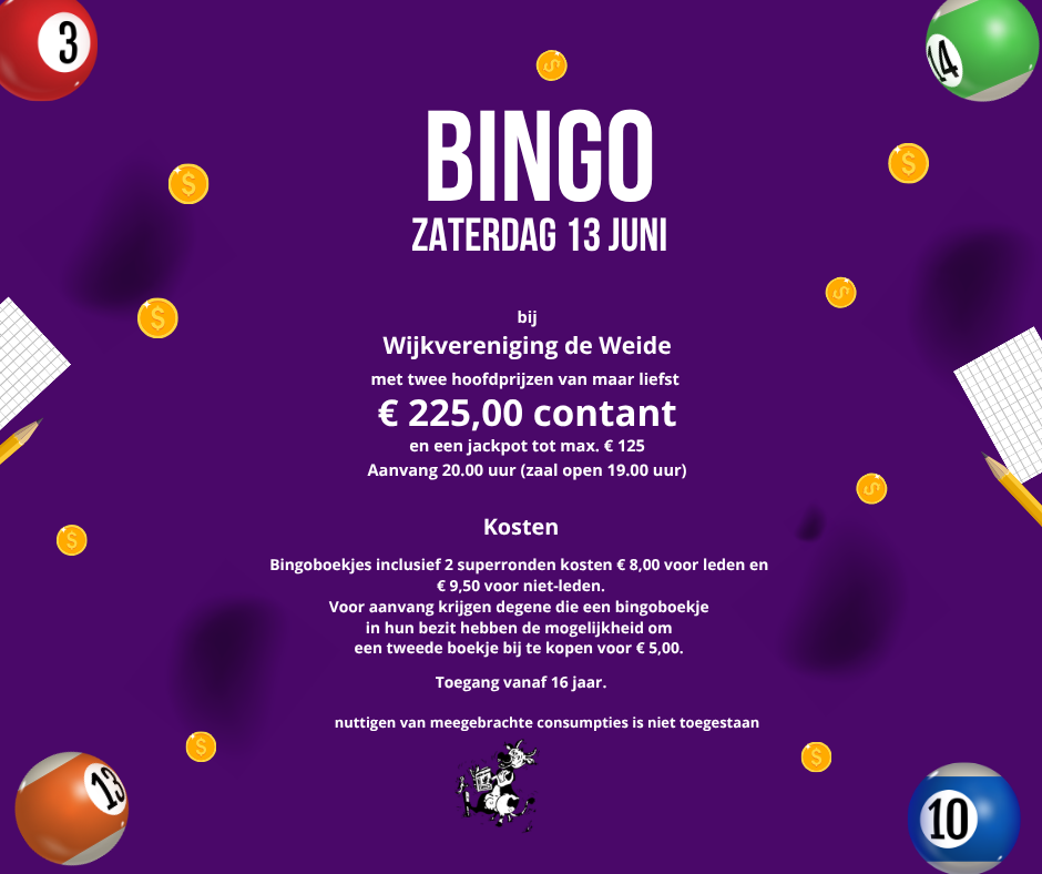 Wijkcentrum De Weideblik De Ploeger 10, Hoogeveen, NederlandWijkvereniging De Weide organiseert een grandioze bingo met maar liefst 2 hoofdprijzen van € 225,00 contant en een jackpot tot max € 125,00 Zaal open om 19:00, Aanvang om 20:00 […]